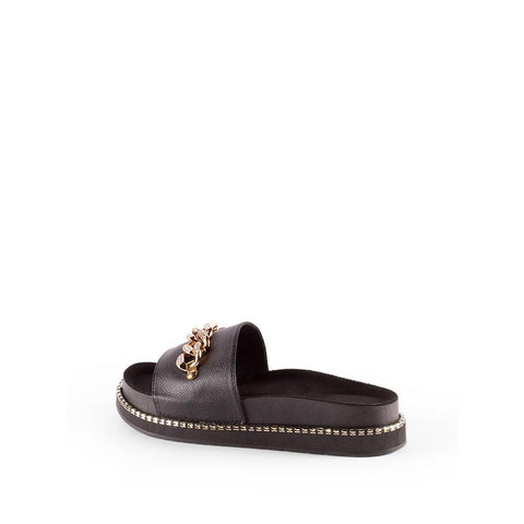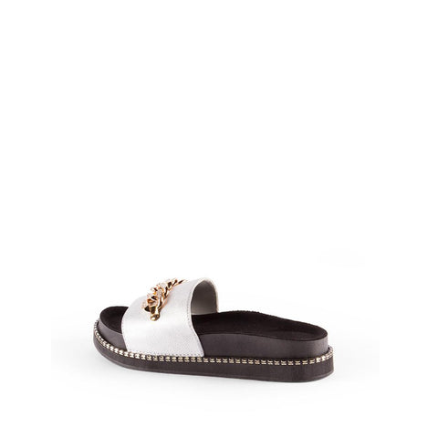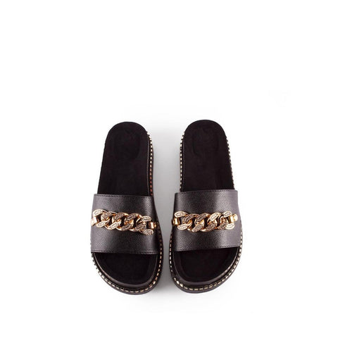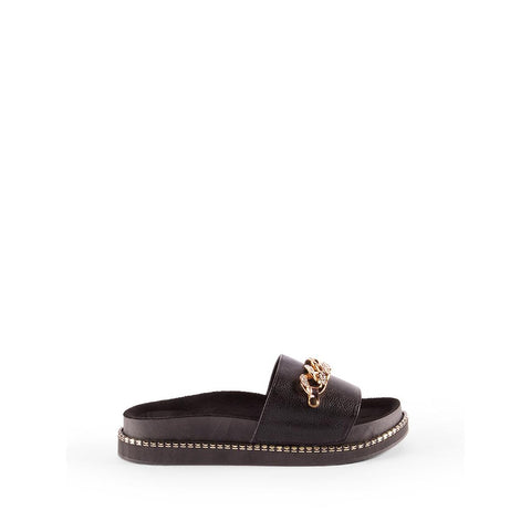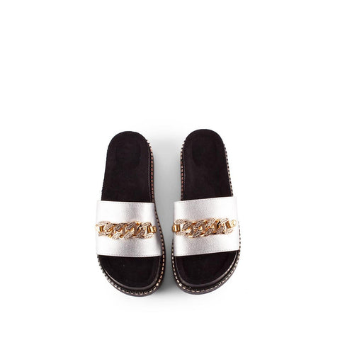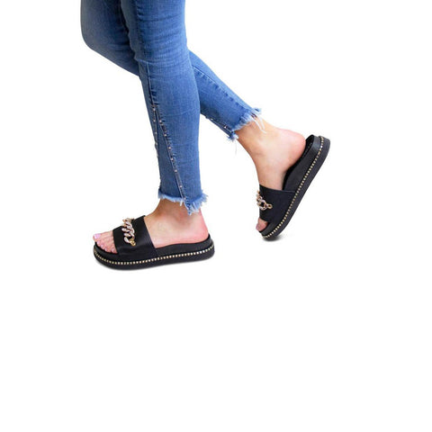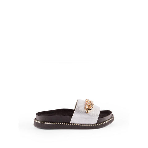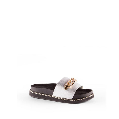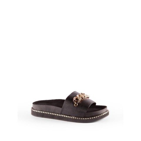 Add some urban cool to your wardrobe with these Darcy Sliders. With a flatform sole with stud detailing, these sliders feature a UP upper with a bold diamante chunky chain embellishment. Available in Silver and Black.