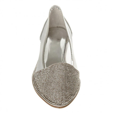A stylish ?ÿflat shoe from the Miss Diva collection. A pointed closed toe shoe embellished with diamantes. With a mesh side and closed in back.?ÿ