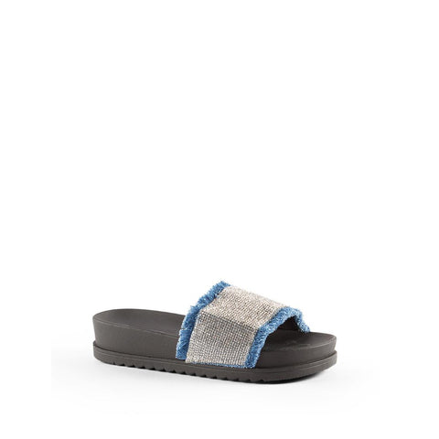Casual meets glamour with these cool new Trinity sliders. With a black comfortable sole, these sliders feature shimmering diamante detailing with a unique and urban denim trim. You'll want to wear these every day, and why not? Go for it girl!