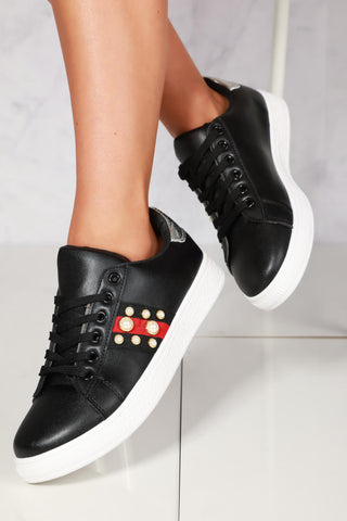 These Ginnie Trainers are some of our all time favourites. These lace up trainers feature three stripes combined with pearl detailing to combine luxury with a cool, casual look. Available in Black and White.